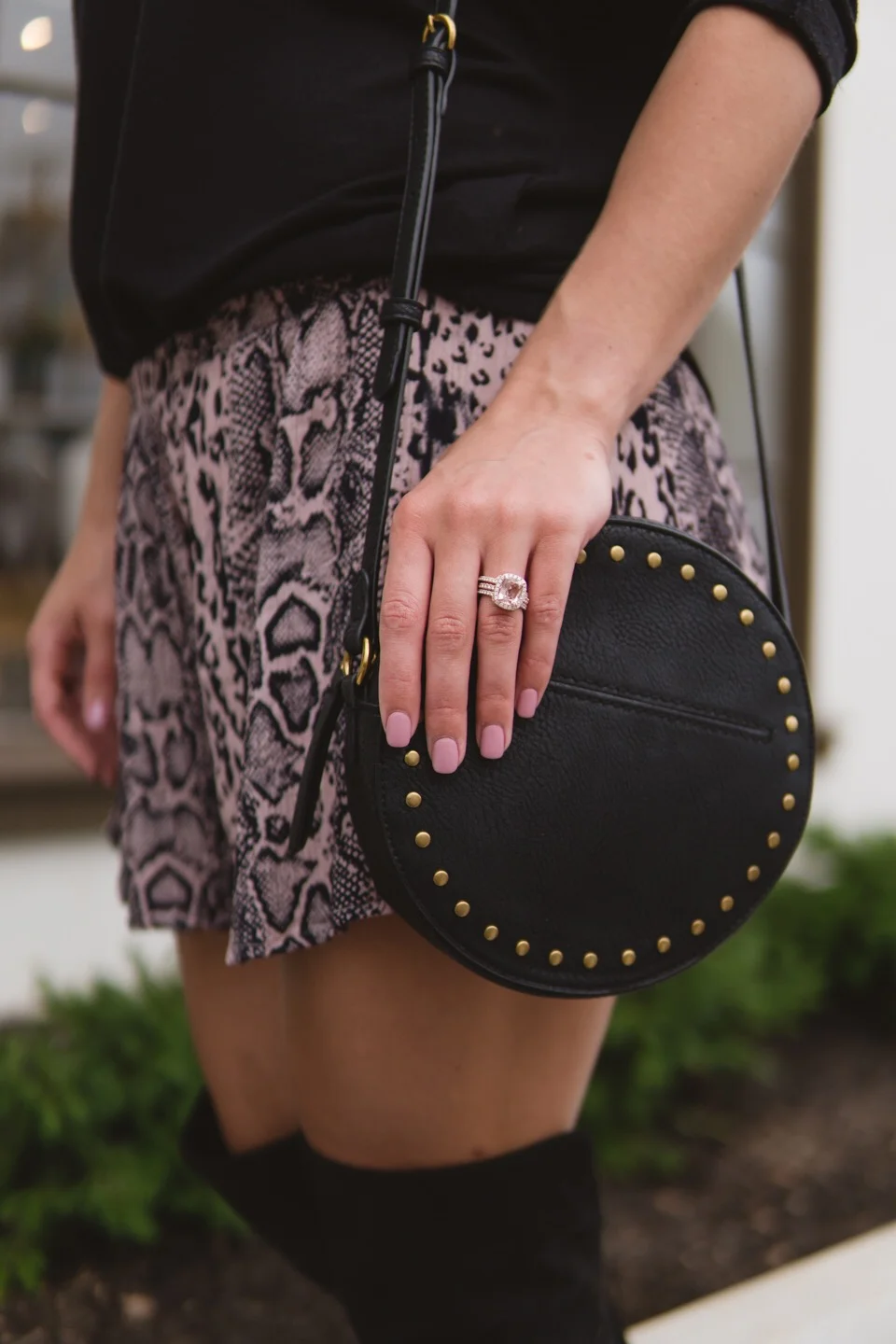 I’m not even sure where I got this shirt to be honest, probably TJ Maxx or Ross Dress For Less. I wear it to work a lot and I love it, especially in the fall because it’s a little thicker but still 3/4 length sleeves. It’s a little longer in the back too, so it is perfect to wear with leggings. I also paired this outfit with that super cute round purse I had in my last outfit post. It goes with so many different outfits and I’m obsessed. I think it goes perfectly with leopard print since it is black with the gold detailing. I got it at my favorite place of all time, Target, for $24.99! I found mine in the clothes not with all the other purses, but check both places. You can always order it online if you don’t want to hunt for it. I will link it for you on the last picture or you can always shop the links in my shop tab.