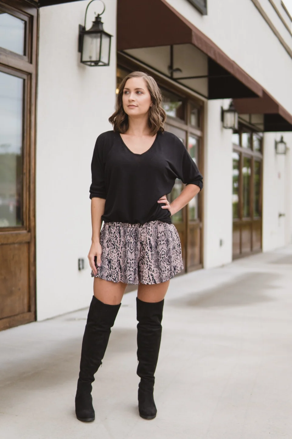 I mentioned before that I live in Tennessee so it’s not quite fall weather yet, but I think we are about to start get cooler temperatures. I think this outfit is a perfect transition piece because even with cooler temperatures coming it still stays pretty warm during the day and cooler at night. That is why I decided to pair this outfit with over the knee boots, because they cover your legs a little more than just shorts and booties or sandals. I love this pair of over the knee boots because they are comfortable and they fit my legs well because they are wide calf. I have bigger calves from running and these fit perfectly. I bought them from Jane last December, but I will try to find them for y’all or at least the shop so you can keep an eye out if they come back in stock. I hope they do come back so I can buy them in taupe!