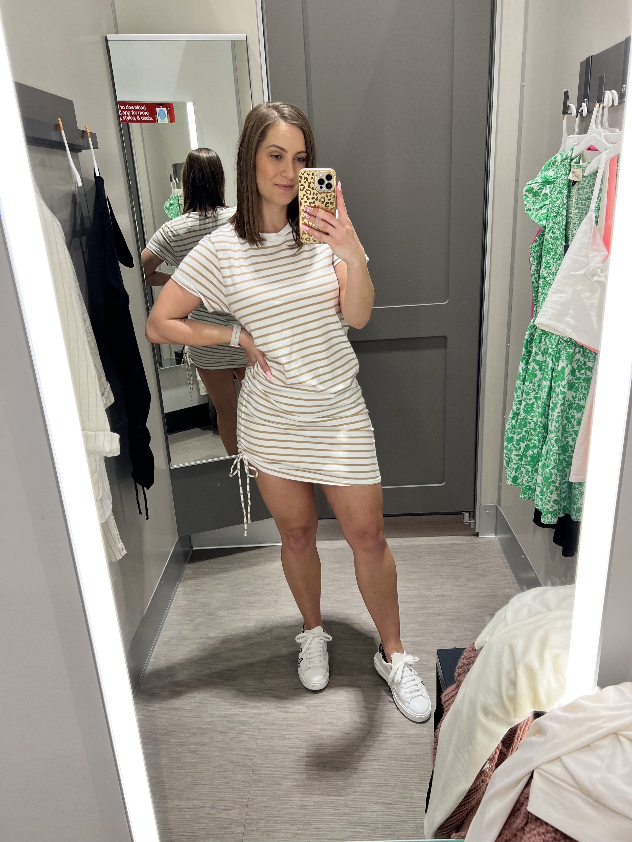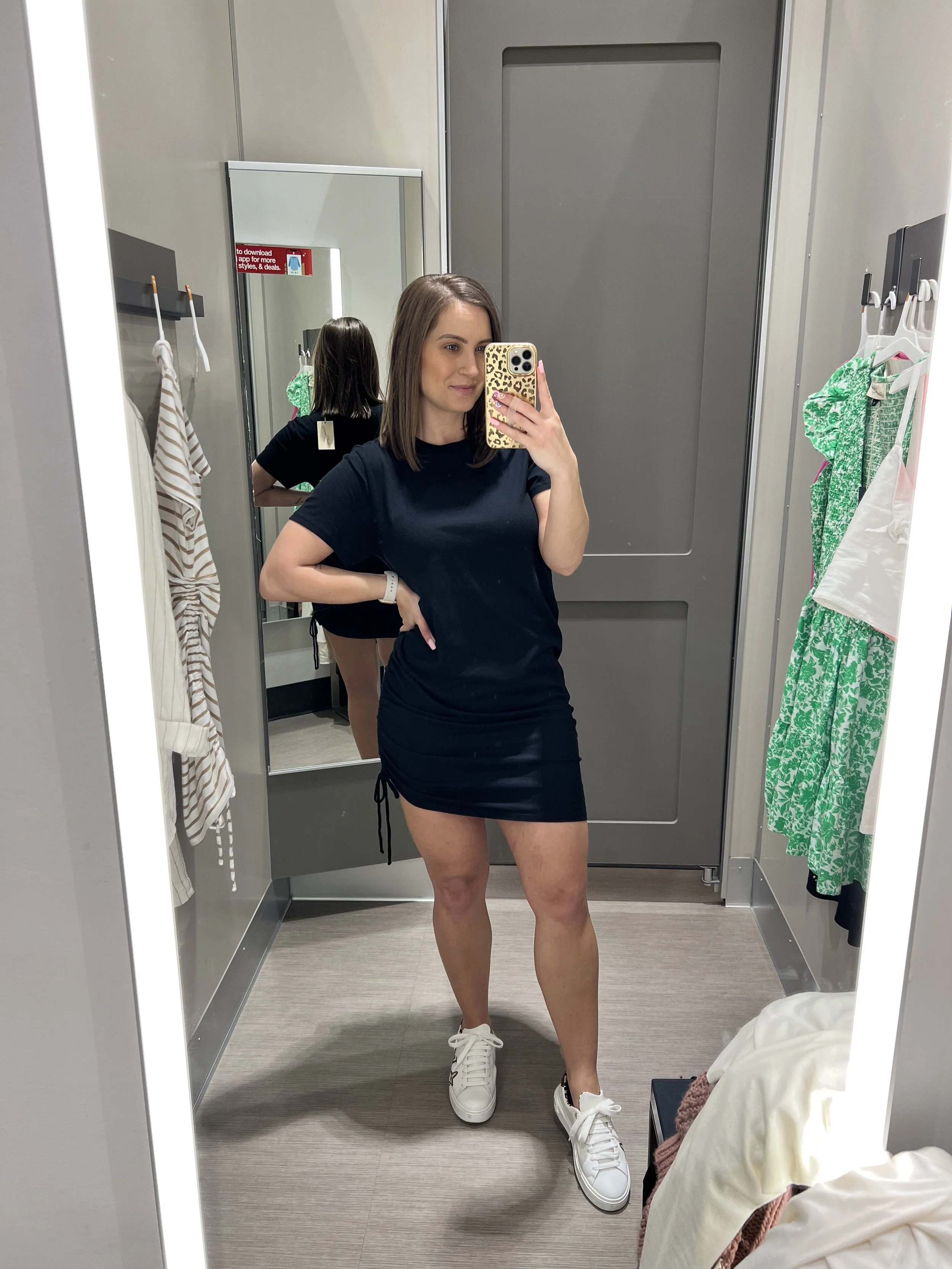T-shirt dresses are my absolute favorite! I have several that I got at Target last year, and this is a new style this year. The scrunch on the side is adjustable and this comes in several colors as well. I am wearing a small.