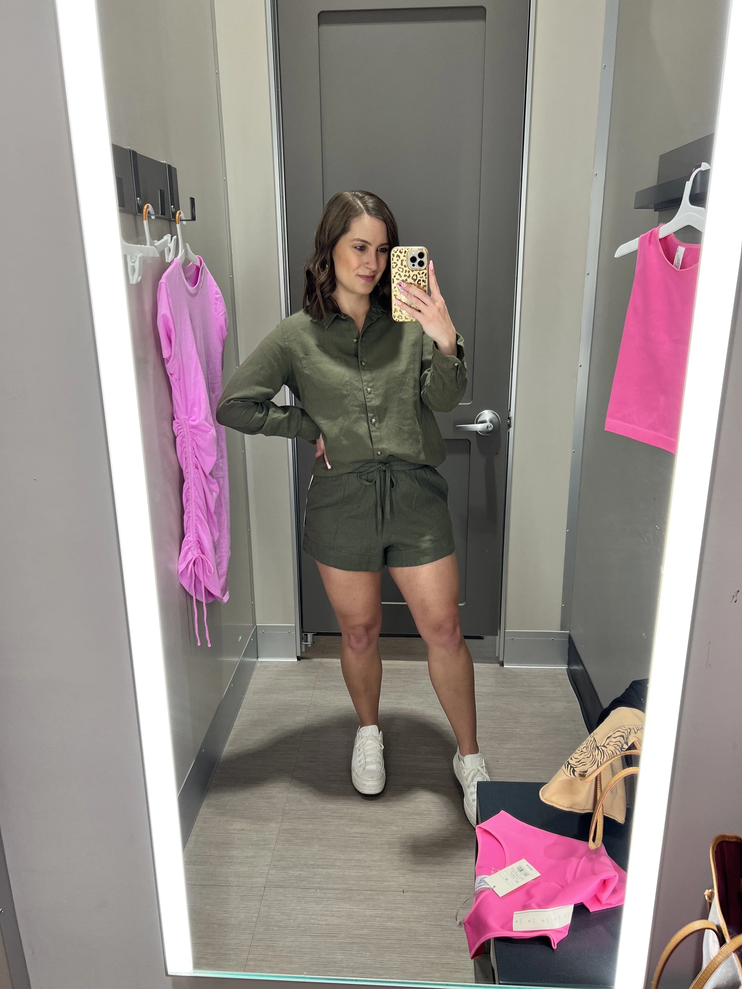 Here is that same set in olive green. I passed on this one but wanted to share for my non pink lovers, lol. In this picture i’m wearing a small in the shorts that fit well and have pockets, and the shirt is an XS but I need a small.