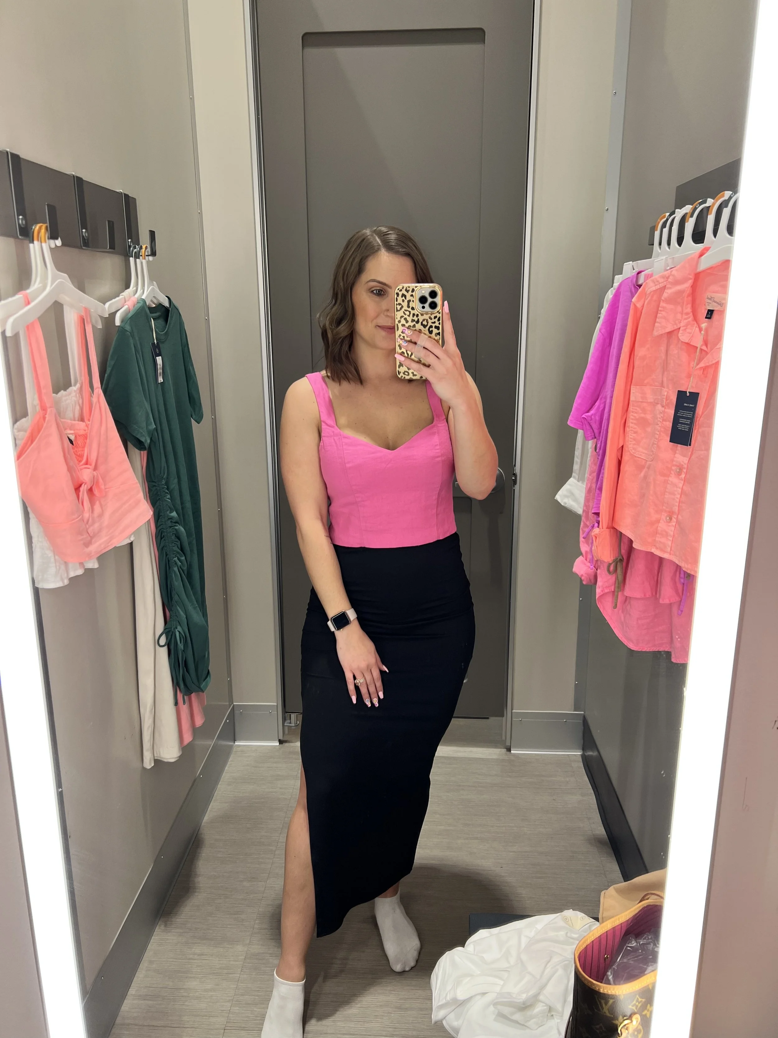 Yall know the color of this top is my favorite. I’m wearing a small in this one too, but it was a little tight in the bust. If I had on sticky boobs it probably would have fit better. It also has adjustable straps and a stretchy back. This has a matching skirt as well, but it is honestly not my favorite. The skirt I have on here is not Target, but I did link it for yall. It’s currently sold out, but they do restock a lot so put your email to be notified!